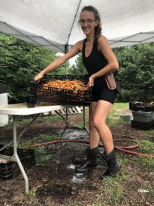 A typical day for the Cottrells includes meeting with their crew to go over the daily plan, managing the irrigation, and working in the nursery or fields. Field work involves transplanting, cultivating or harvesting, and washing and packing vegetables. Adam says he and Jocelyne both share in all the duties of the business from planting, seeding, and driving tractors to managing crew and going to market. “There’s no aspect of this business that either of us can’t do. But there are aspects that one of us enjoy doing more. I do more of the nursery work because that’s what I enjoy. Jocelyn really manages the CSA because that’s her thing.”